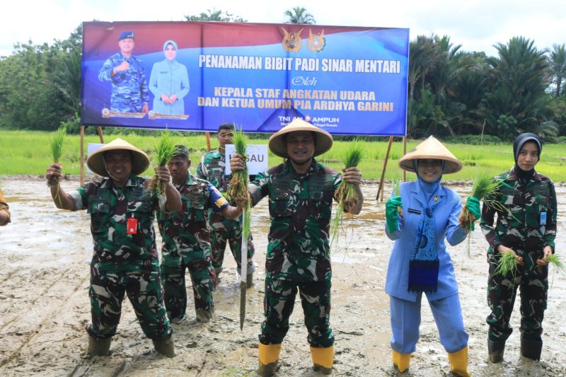 Kasau dan Ketum PIA Ardhya Garini melanjutkan kegiatan di Desa Aha dalam rangka Penanaman Bibit Padi Unggul Sinar Mentari guna mendukung Program Ketahanan Pangan Nasional.